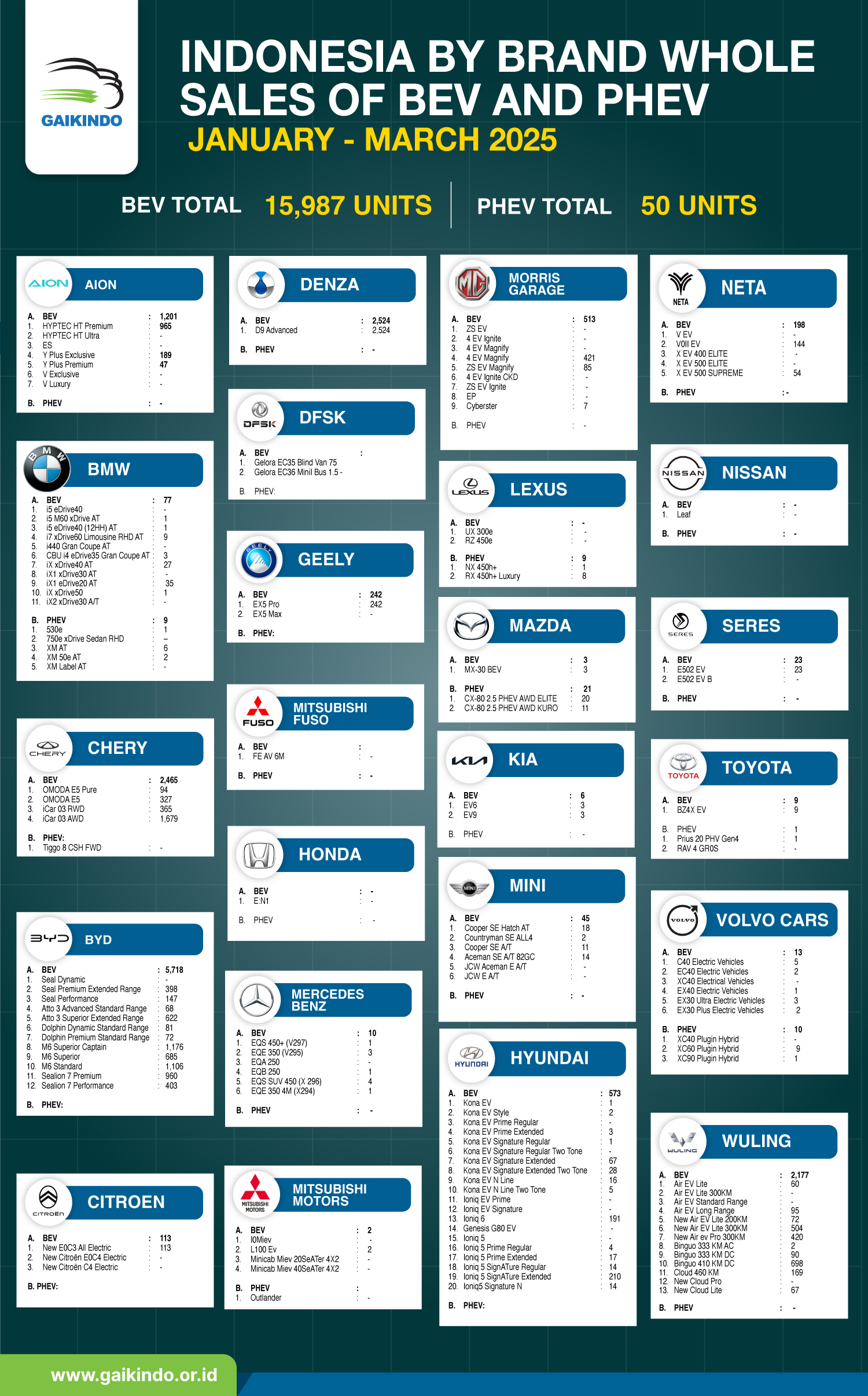 Indonesia EV and PHEV Whole Sales by Brands, January – March 2025