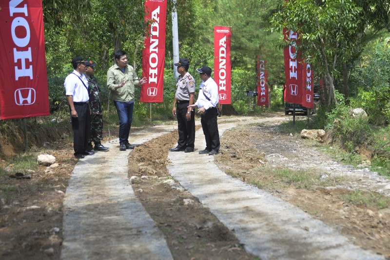 Marketing & After Sales Service Director PT Honda Prospect Motor (HPM) Jonfis Fandy (tengah) berbincang dengan perangkat desa ketika melihat jalan beton sumbangan PT HPM yang dikerjakan kelompok masyarakat sadar wisata di sekitar Pantai Jungwok, Gunung Kid