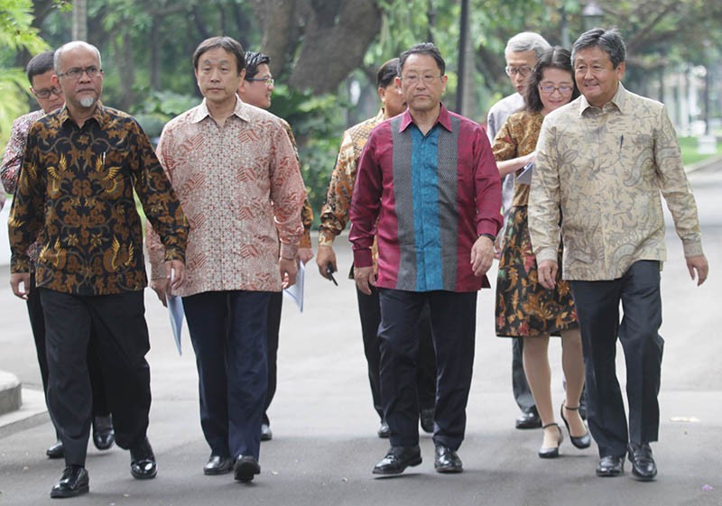 Presiden Toyota Motor Corporation (TMC) Akio Toyoda (keempat kanan) didampingi Senior Managing Officer TMC Shigeru Hayakawa (kedua kiri), Wakil Presiden Direktur PT Toyota Motor Manufacturing Indonesia (TMMIN) Warih Andang Tjahjono (kiri), CEO of Asia, Mi