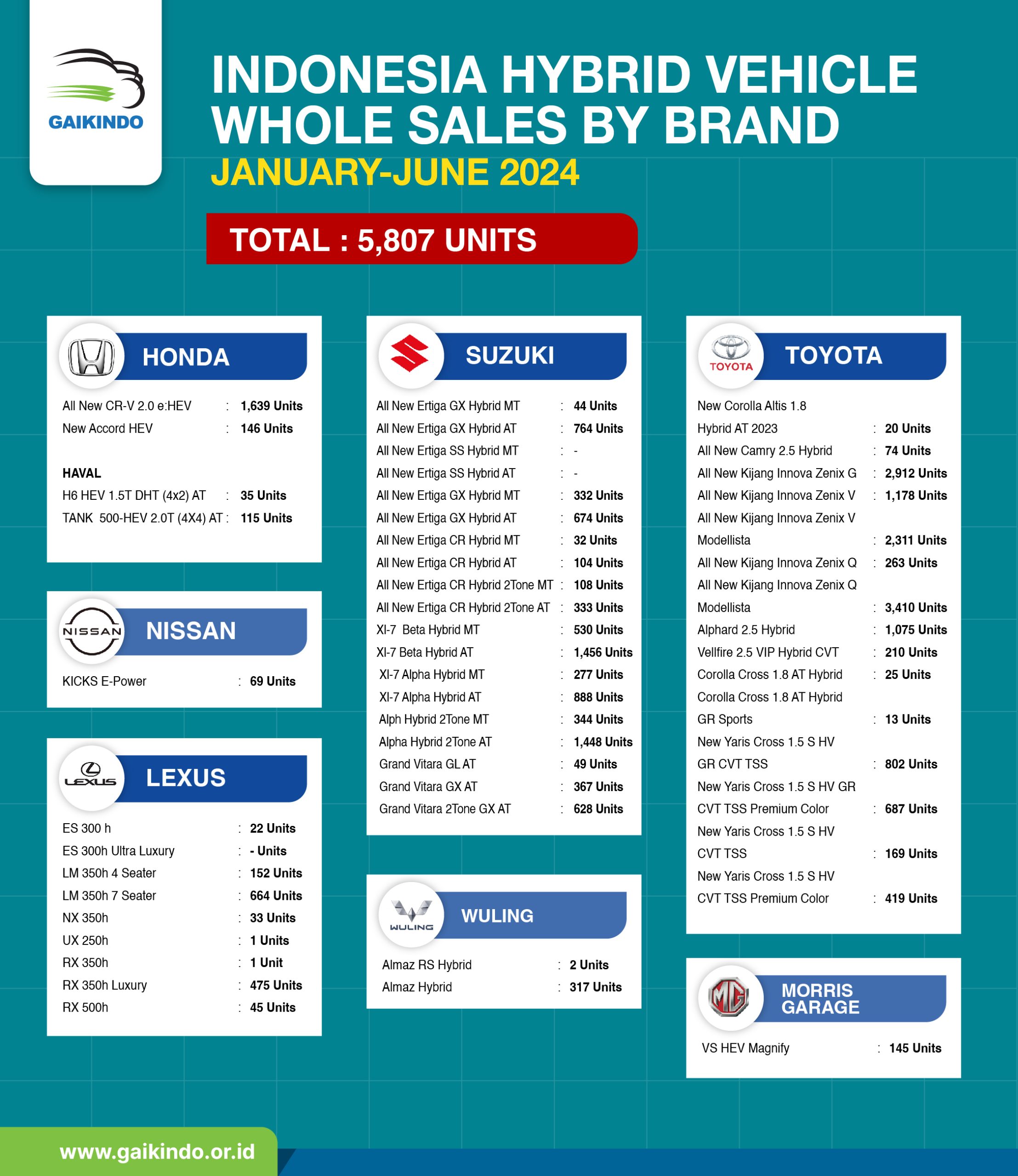 Indonesia Hybrid Vehicle Whole Sales by Brand January – June 2024