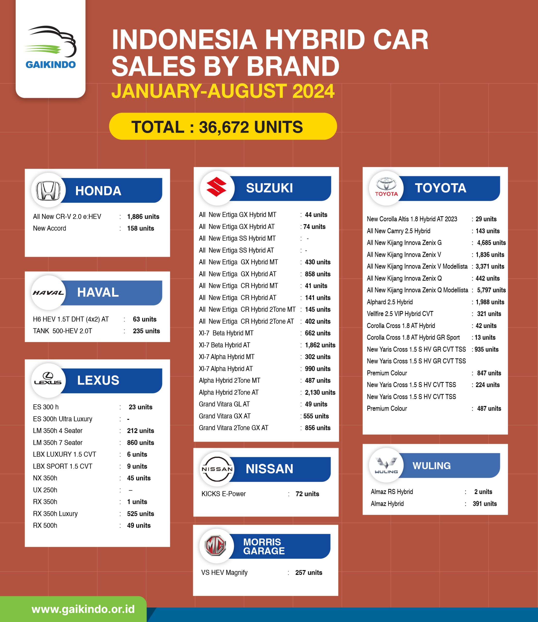 Indonesia Hybrid Vehicle Whole Sales by Brands, January – August 2024