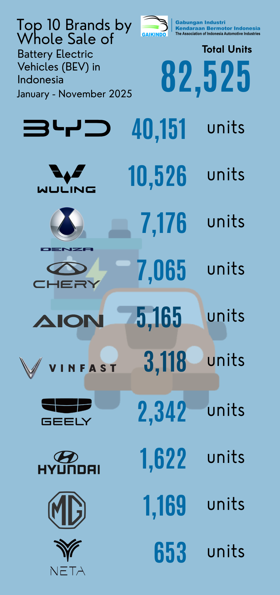 Top 10 Brands by Wholesale Volume of Battery Electric Vehicles in Indonesia, January–November 2025