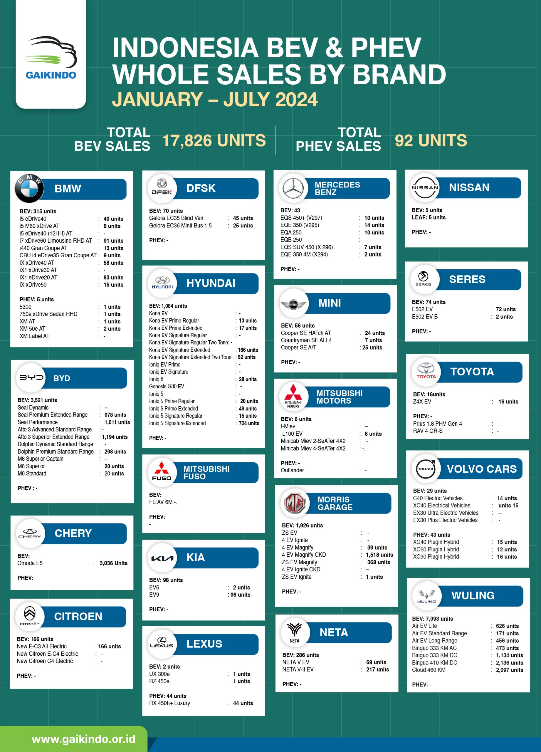 Indonesia Total by Brand Whole Sales of BEV and PHEV January – July 2024