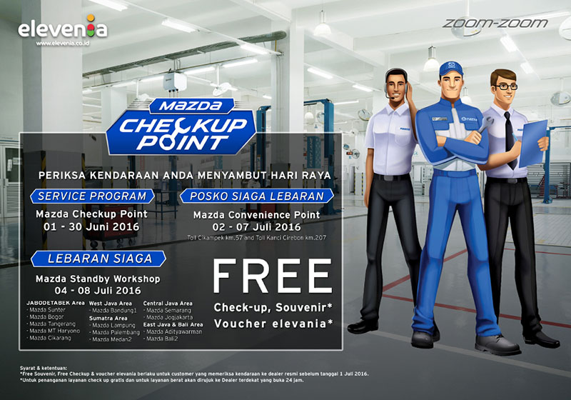 Posko Siaga Lebaran (Mazda Convenience Point) berada di rest Area Km 57 Tol Jakarta-Cikampek dan Km 207A Tol Palikanci (arah Jawa Tengah) dari 2 hingga 7 Juli 2016. Di situ tersedia bagi semua pengguna mobil Mazda yang butuh pemeriksaan dan perbaikan ringan. “Untuk perbaikan berat akan diarahkan ke dealer Mazda layanan 24 jam terdekat,” Customer Service Director PT Mazda Motor Indonesia Seiji Toyota.