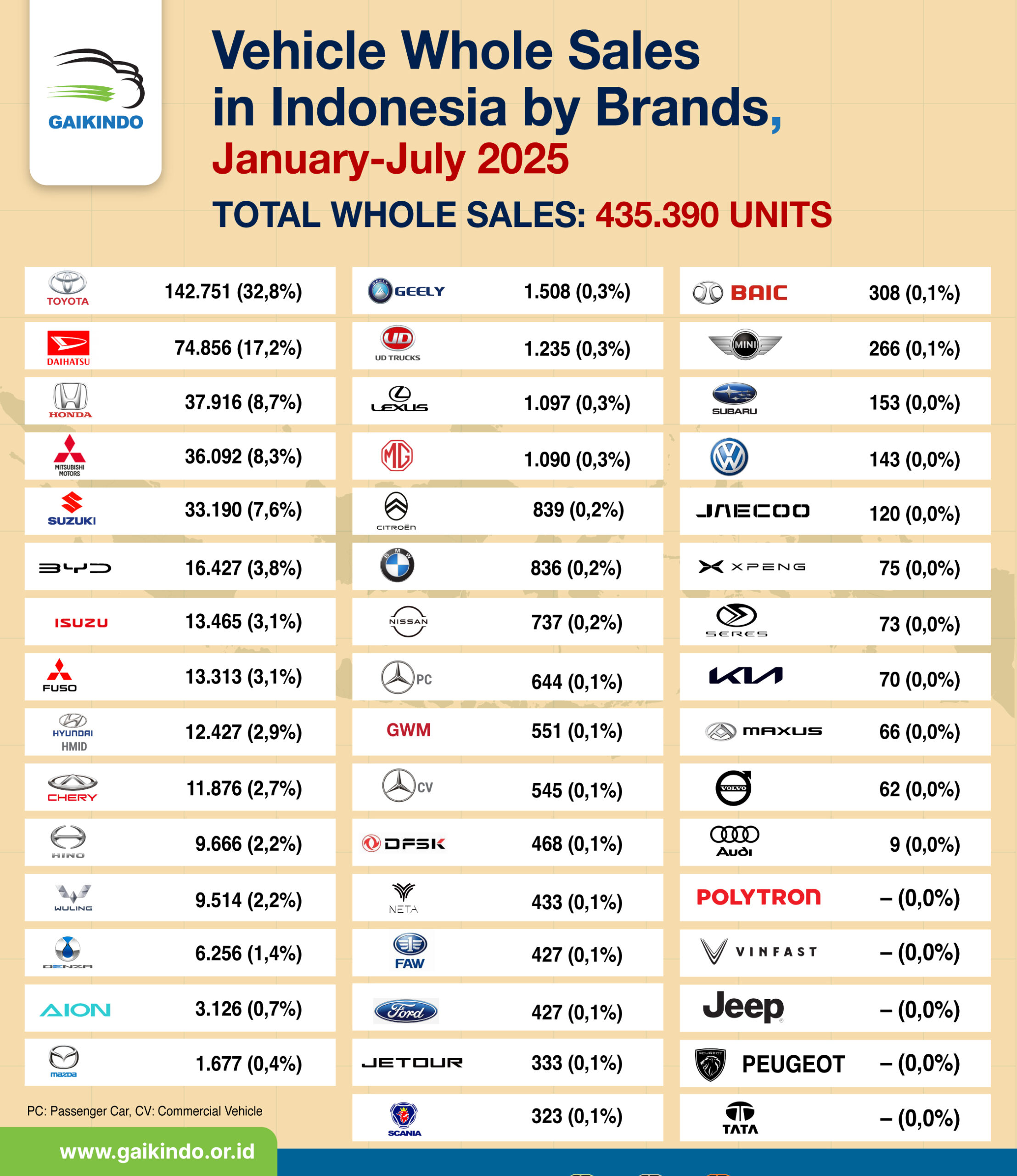 Vehicle Whole Sales in Indonesia by Brands, January-July 2025