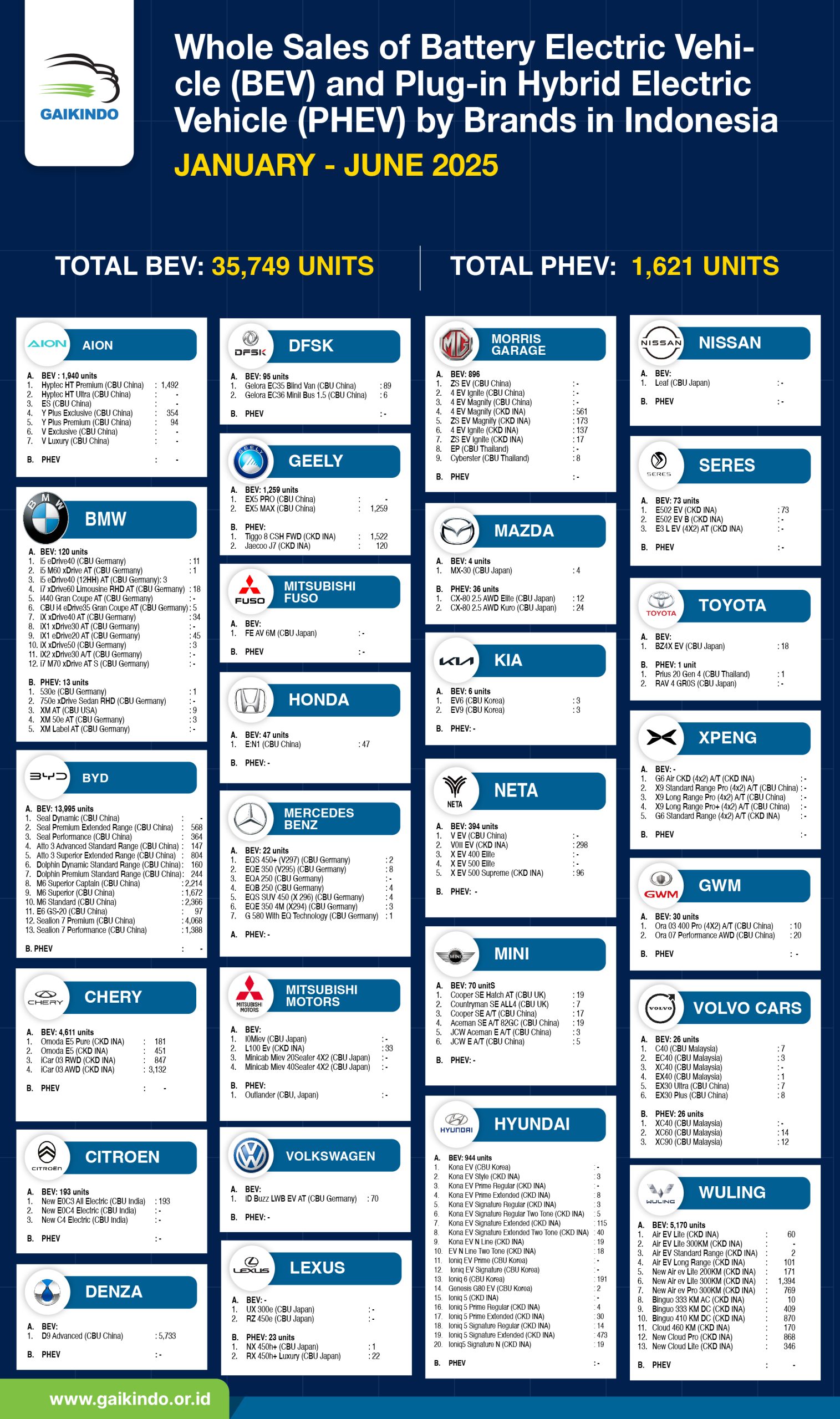 Whole Sales of Battery Electric Vehicle (BEV) and Plug-in Hybrid Electric Vehicle (PHEV) by Brands in Indonesia, January-June 2025